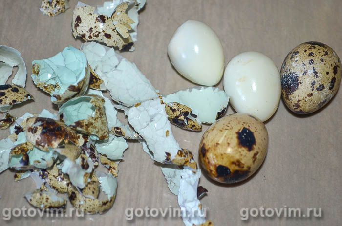 Чтобы легко очистить вареные яйца перепелов ими нужно хорошо постучать по поверхности стола. После чего покатать расколотое яйцо по столу. Подцепить кусочек скорлупы пальцами. Потянуть за неё так, чтобы вся скорлупа снялась практически за одно — два движения.