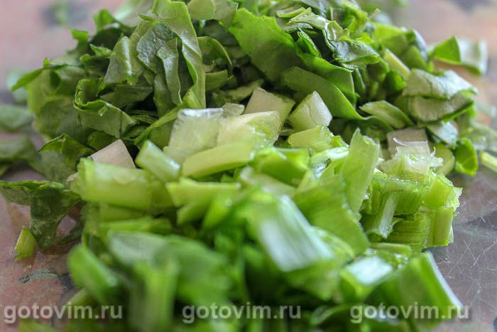 Шпинат и зеленый лук вымыть, стряхнуть и обсушить полотенцем, измельчить.