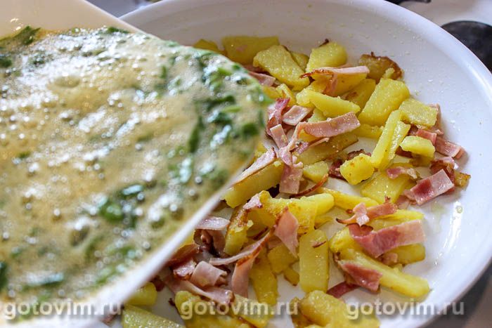 Взбитые яйца вылить на сковородку с картошкой и колбасой.