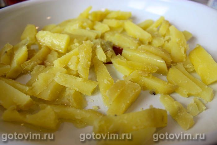 Картофель, сваренный в мундире, очистить и нарезать небольшими брусочками. Такими же брусочками порезать колбасу.