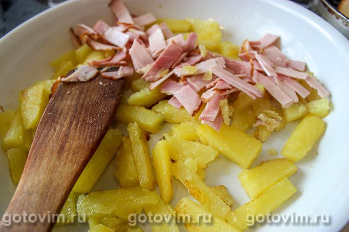 Добавить к картофелю брусочки ветчины, смешать и жарить несколько минут на слабом огне, пару раз перевернуть для равномерной прожарки.