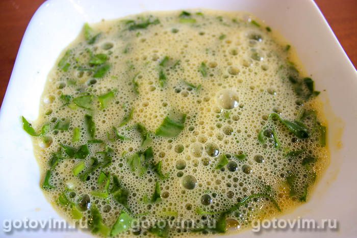 Яйца взбить, высыпать в них зелень, посолить, можно добавить щепотку перца.