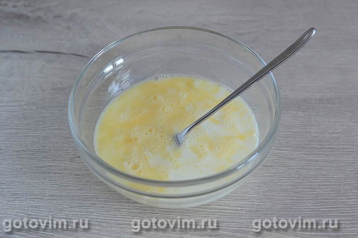 Влить в миску с яйцам молоко и взболтать вилкой. Важно не взбивать, а просто немного перемешать.