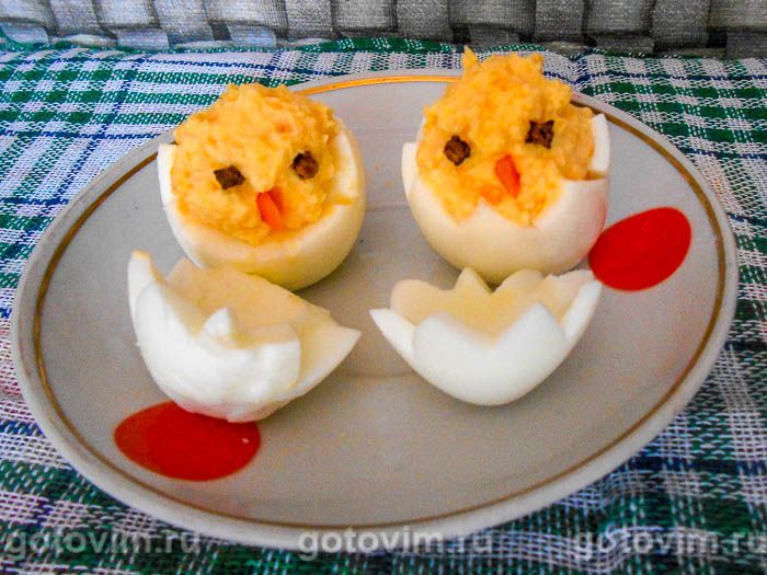 Полученной желтковой массой наполняем нижнюю часть белков. Чтобы цыплята устойчиво стояли, нужно немного подрезать нижнюю половинку белка.
