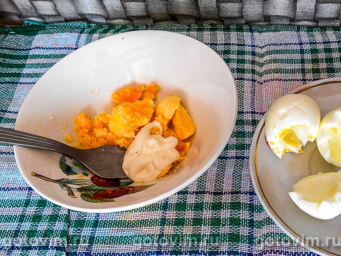 Теперь аккуратно вынимаем желтки и в отдельной тарелке смешиваем их с майонезом, солью и приправами (при желании).