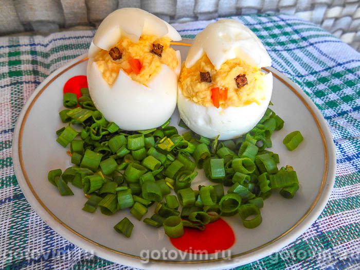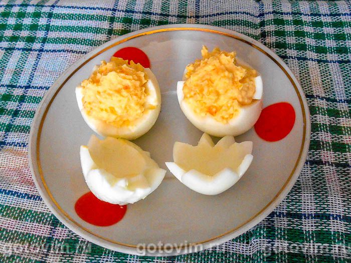 Закуску из фаршированных яиц обычно подают на лодочках из яичных половинок, но можно и так, как описано в этом рецепте. По желанию в начинку можно добавить любую зелень на ваш вкус.