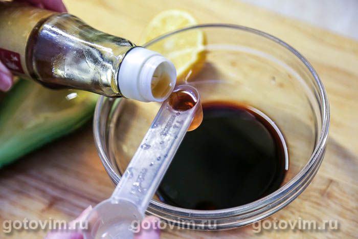 Для соуса смешать в небольшой миске соевый соус, кунжутное масло и свежевыжатый сок дольки лимона. В оригинальном рецепте вместо лимона предлагают взять лайм.