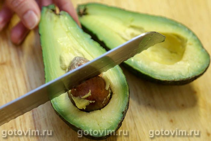 Авокадо разрезать пополам (надрезать кожицу и мякоть вдоль по окружности), удалить косточку и ложкой поддеть мякоть, отделяя её от кожицы. Нарезать мякоть авокадо дольками толщиной около 5 мм или кубиками.