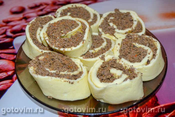 Аккуратно свернуть рулет. Острым ножом нарезать рулет с печенью в яичном тесте на порционные куски и уложить на сервировочное блюдо. Приятного аппетита!