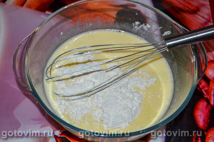 Добавить туда же муку. Снова все размешать венчиком до однородности.