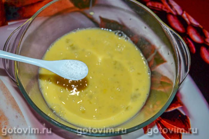 Приготовить тесто. Яйца взбить венчиком. В яичную массу положить соль, сметану и майонез. Хорошо перемешать.