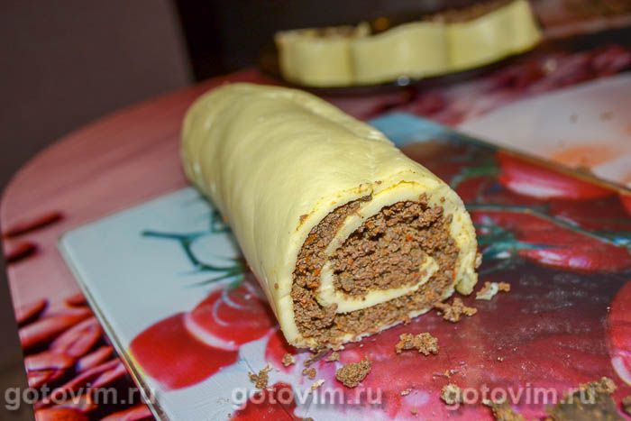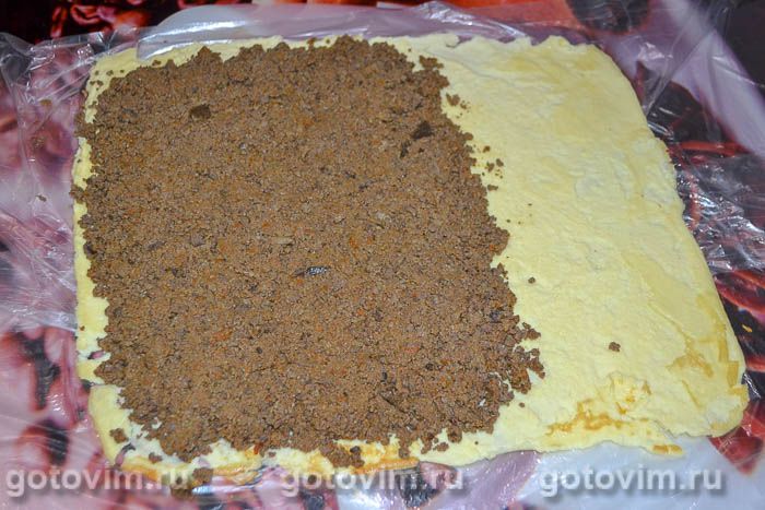 Готовую, остывшую основу переложить на ровную поверхность стола. Начинку из печени аккуратно выложить на основу, причем чтобы ничего не распадалось, печень следует примять пальцами рук.
