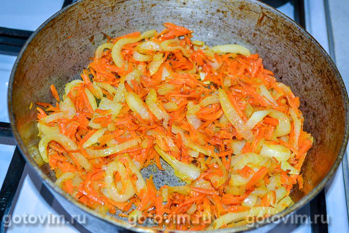 Приготовить начинку. Для этого, нарезать полукольцами лук, крупно натереть морковь. Говяжью печень вымочить в воде или молоке, нарезать средними кусочками. В сковороду влить немного растительного масла, раскалить его, положить лук и морковь. Жарить на средне огне до золотистого оттенка.