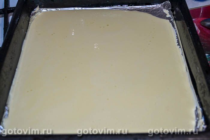 Духовку прогреть до 180С. Застелить противень пергаментом или фольгой. Промазать бумагу для выпечки маслом. Влить тесто на противень и выпекать 7-10 минут.