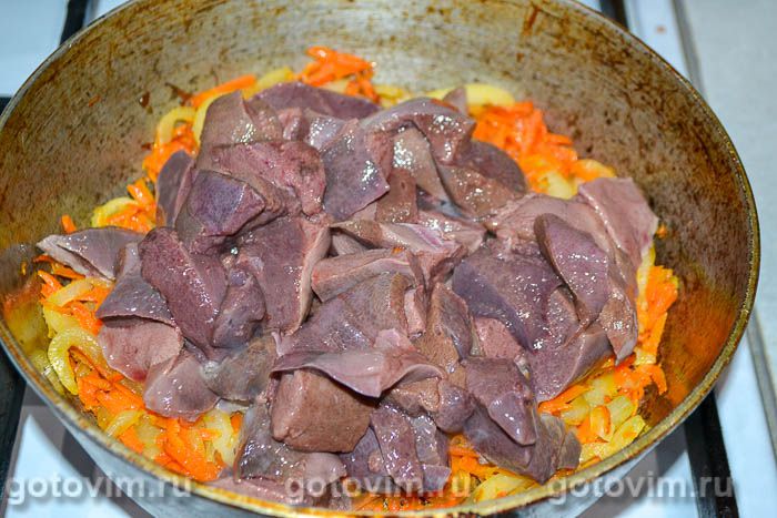 Затем отправить в сковороду куски подсоленной печени. Периодически помешивая, тушить на слабом огне около 15 минут.