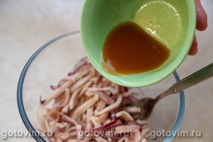Для этого салат кальмаром можно даже не варить, а трижды залить кипятком и каждый раз держать в воде по 3 минуты. Правда, после не забудьте почистить тушки головоногих от темных и светлых плёночек на коже и удалить хорду. Для заправки будет достаточно смешать венчиком растительное масло с соевым соусом и соком лимона. Остальные подробности – в рецепте ниже.
