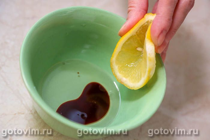 Для салатной заправки в отдельной миске взбить венчиком растительное масло с соевым соусом и лимонным соком.