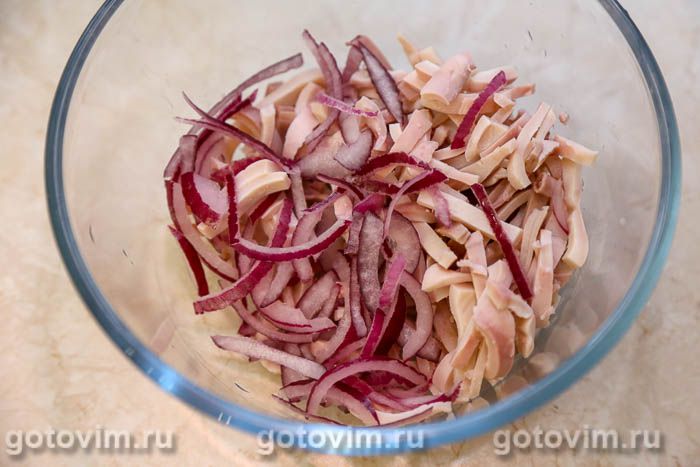Вареных кальмаров порезать соломкой и сложить в салатник подходящего размера.