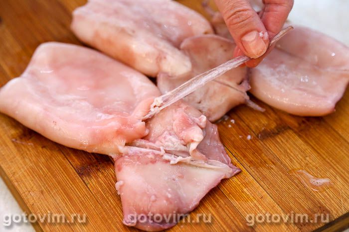 Тушки кальмаров промыть, залить кипятком на 1-2 минуты, затем переложить в холодную воду и очистить от темной и светлой плёночен на поверхности и внутри тушки. Удалить хорду и внутренности (если есть).