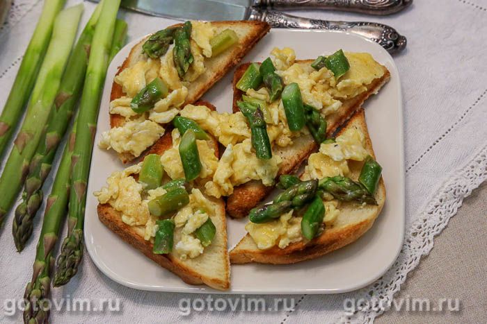 Обжарить ломтики хлеба на сливочном масле или тостере/ростере. На каждый тост выложить яичницу болтунью с вареной спаржей и подавать на стол. Приятного аппетита!