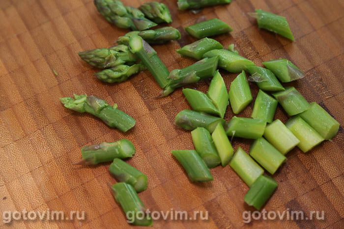Спаржи сполоснуть под проточной холодной водой и подготовить к варке. Для этого срезать грубую часть побегов, оставив только вкусную нежную часть. Есть два способа сделать это.