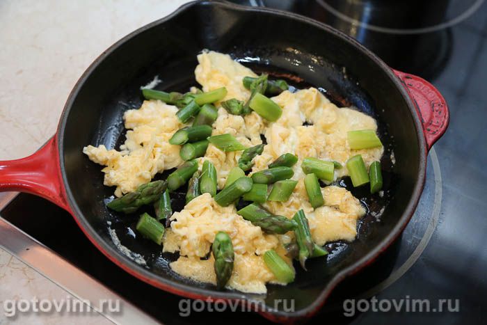 буквально через 10 секунд переложить в сковороду с яичницей болтуньей спаржу. Перемешать, чтобы кусочки спаржи равномерно распределились в толще яичницы. Снять сковороду с плиты, прикрыть крышкой, чтобы яичница-скрэмбл оставалась горячей.